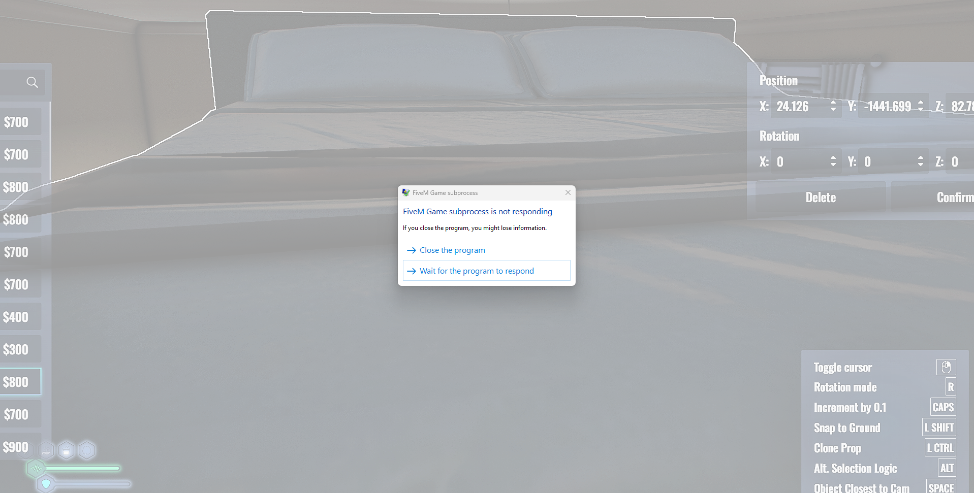 As soon as i go to select any piece of furniture it crashes me