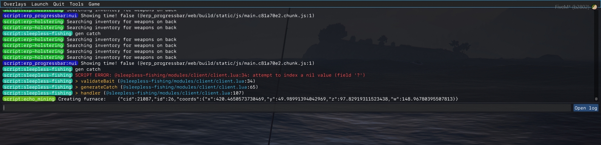 Fishing Bug: Currently you throw your pole out anywhere in the ocean and it bugs out, you cannot cancel the fishing, and you do not get the fishing mini-game. You just sit there, and it throws an error in the F8 Menu.