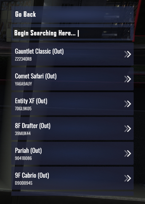 Adding a search feature for Tom’s Used Car’s vehicle menu, so that when typed in, filters the vehicles out by the input. So, if I’m trying to let someone test drive a Coquette D10, I could start typing “Coq” and it would filter to all of the vehicles TUC has in stock with that in their name; Coquette Sport, Coquette Classic, Coquette D10